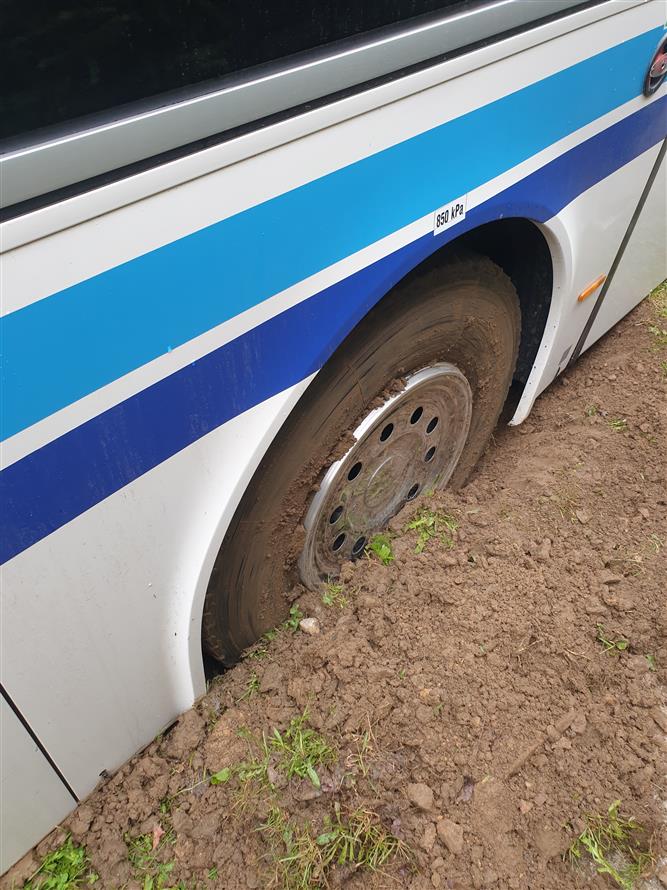 - Zapadlý autobus v blátě, nakloněný